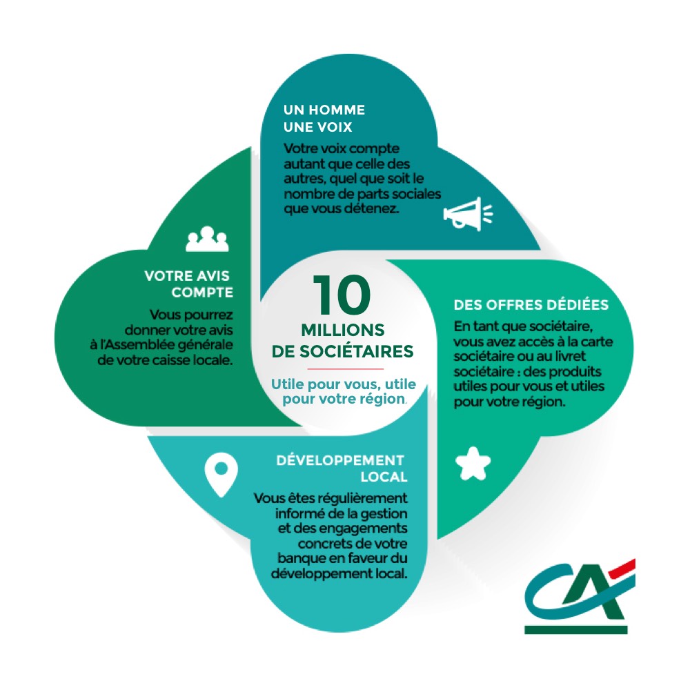 Être sociétaire d’une banque coopérative, c’est pouvoir vous faire entendre lors des Assemblées Générales de votre caisse locale, c’est aussi participer aux initiatives de votre région et bénéficier d’avantages concrets pour une relation gagnant-gagnant comme 10 millions de sociétaires.